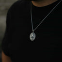 The Horse Coin Necklace from Theswaf is a distinguished piece that celebrates the noble spirit of the horse. Encased in a pendant of oxidized sterling silver, the profile of a majestic horse is exquisitely carved, its mane flowing with a sense of motion and freedom. Surrounding the horse is a classic Greek key design, known as a meander, symbolizing infinity and unity.